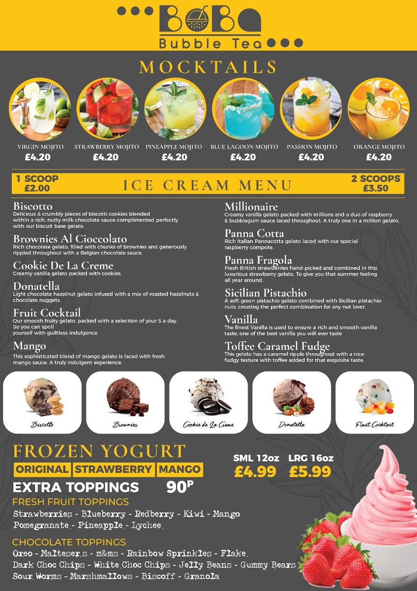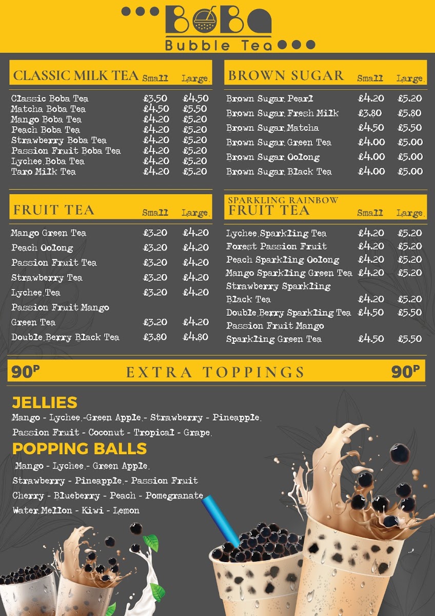 At Boba Bubble Tea, the menu offers a delightful selection of drinks and snacks that are both comforting and refreshing. The standout item is, of course, the Bubble Tea, which comes in a variety of flavors like classic milk tea, fruit teas, and even creative combinations such as matcha and taro. Prices are reasonable, with most options available for around £4.50, making it an affordable treat for any occasion. The shop also offers a range of toppings to customize your drink, from chewy tapioca pearls to fruity popping boba. Alongside the drinks, there are light bites like bubble waffles and savory snacks that perfectly complement the refreshing teas. Whether you're a bubble tea enthusiast or just looking for a fun, casual experience, Boba Bubble Tea’s menu has something for everyone, delivering quality drinks and bites at an accessible price point.